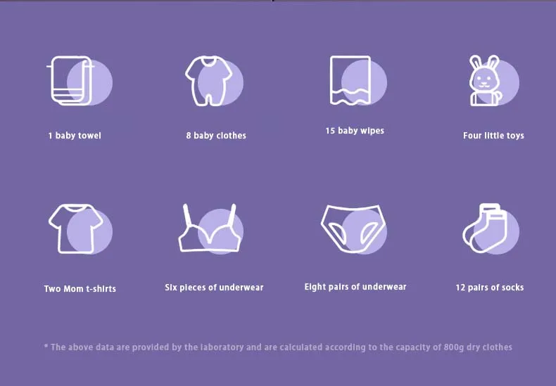 1. Grande capacidade: 29,5 x 29,5 x 29 cm, uma lavável: 1 toalha de banho de bebê, 8 roupas de bebê, 15 suéteres de bebê, 4 brinquedos pequenos, 2 camisetas para mães, 6 roupas íntimas, 8 roupas íntimas e 12 pares de meias (os dados acima são fornecidos pelo laboratório para cálculo da capacidade de roupas de 800 g; consulte a nossa capacidade real para informações específicas.)